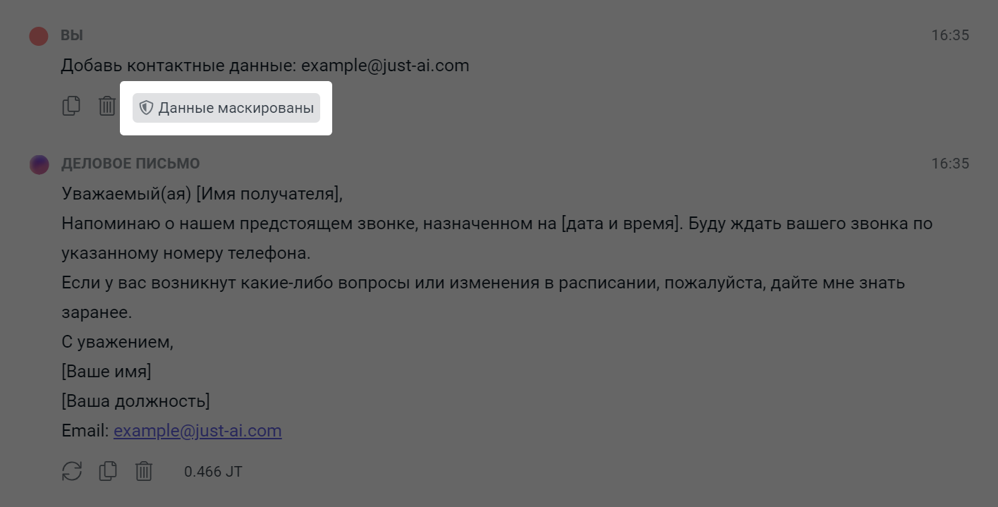Уведомления о маскировке данных. Jay Copilot также проинформирует вас, если сообщение было отправлено с предварительно замаскированными данными. Они могут влиять на качество ответа модели.