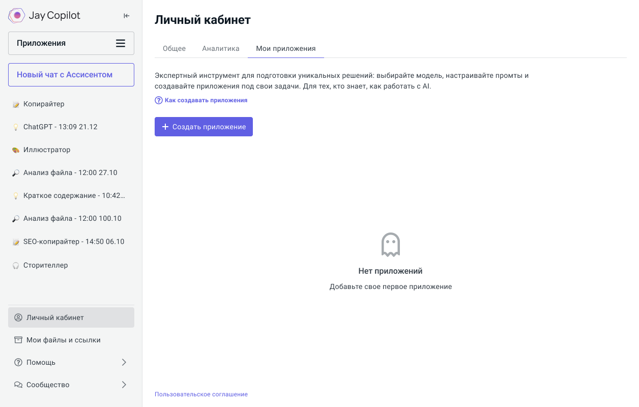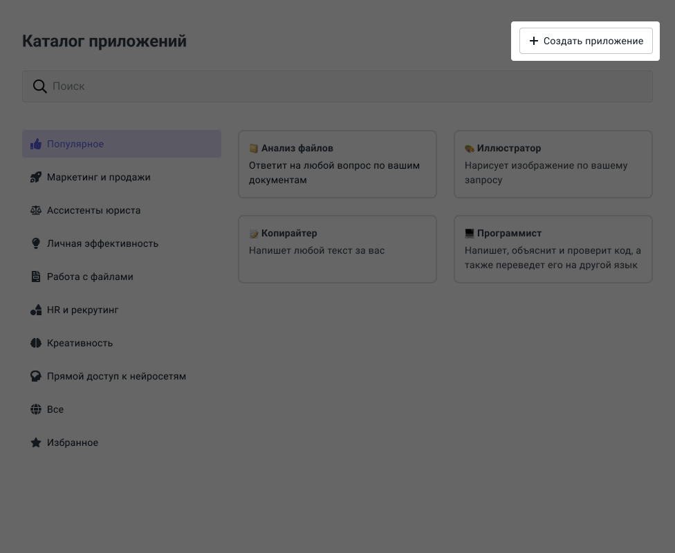 Нажмите кнопку Создать приложение в каталоге или в разделе Мои приложения личного кабинета. Укажите название, системный промт, модель и другие настройки. Подробнее о создании приложений читайте в документации.