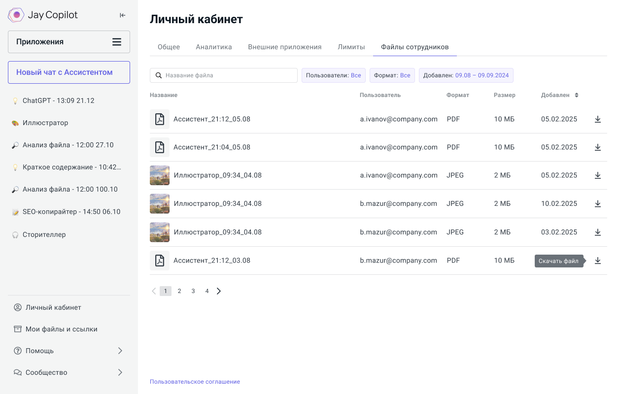 Администраторы аккаунта теперь могут просматривать файлы пользователей в личном кабинете. Для этого перейдите в раздел Личный кабинет → Файлы сотрудников.