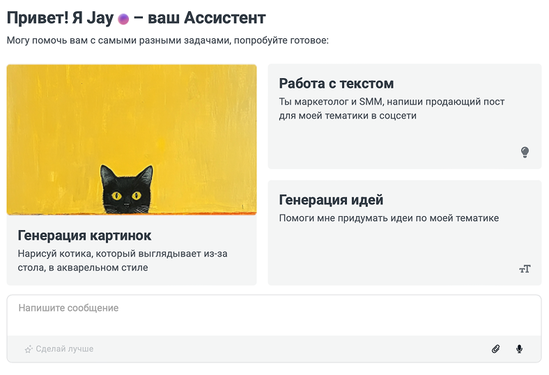 Мы знаем, что начинать работу с генеративными моделями с «чистого листа» бывает непросто. Поэтому добавили в Ассистент Jay готовые стартовые сценарии.