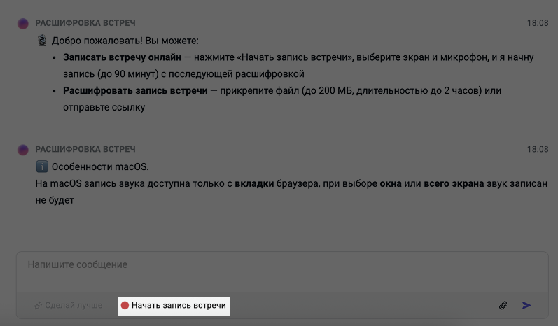 - «Расшифровка встреч» — теперь в онлайн-режиме! Больше не нужно использовать сторонние программы и вручную загружать записи. Просто нажмите Начать запись и сразу после встречи получите полную транскрипцию, по которой можно тут же задавать вопросы и уточнять ключевые детали. Подробнее