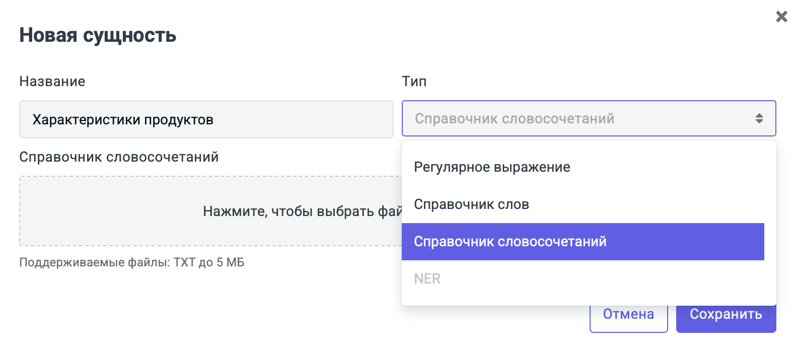 В Jay Guard добавлен новый тип сущности — «Словарь словосочетаний». В отличие от «Справочника слов», он ищет точное вхождение фразы с учетом словоформ. Это позволяет находить составные термины и снижает количество ложных срабатываний. Новый тип сущности доступен при создании или редактировании в разделе «Пользовательские сущности».