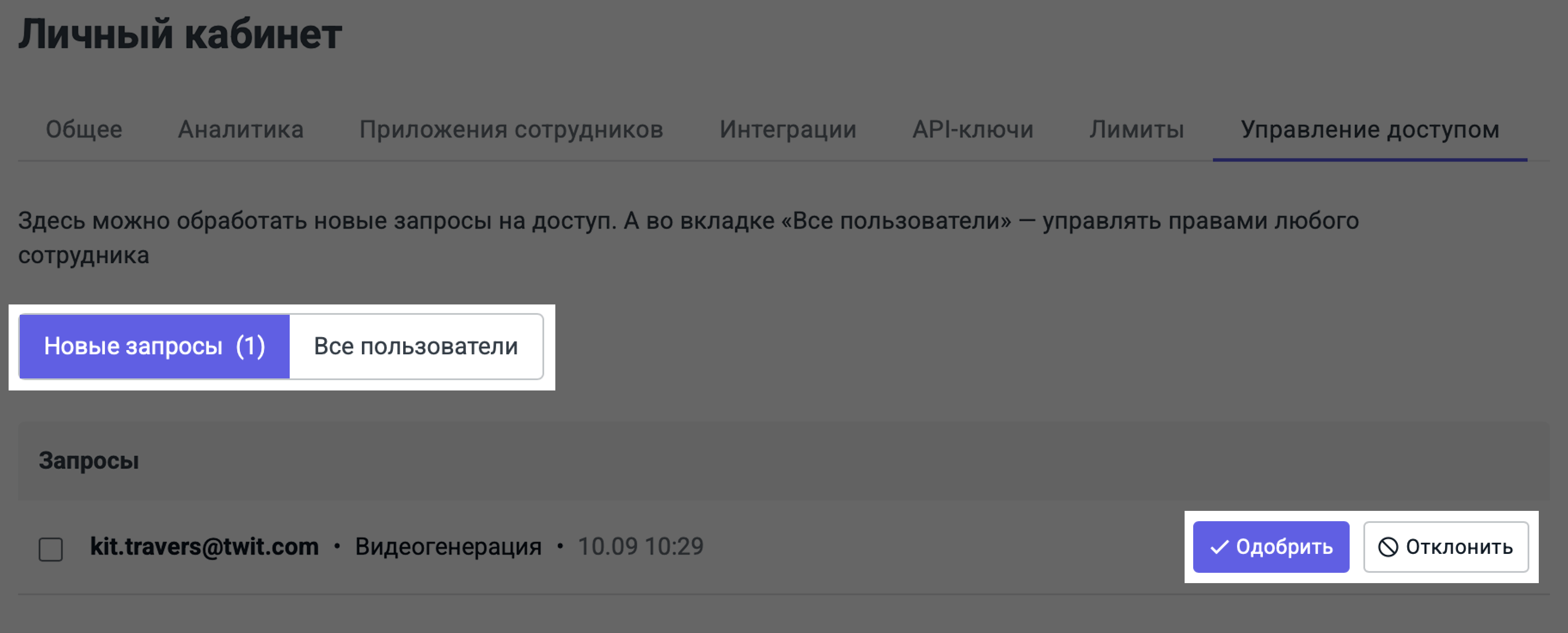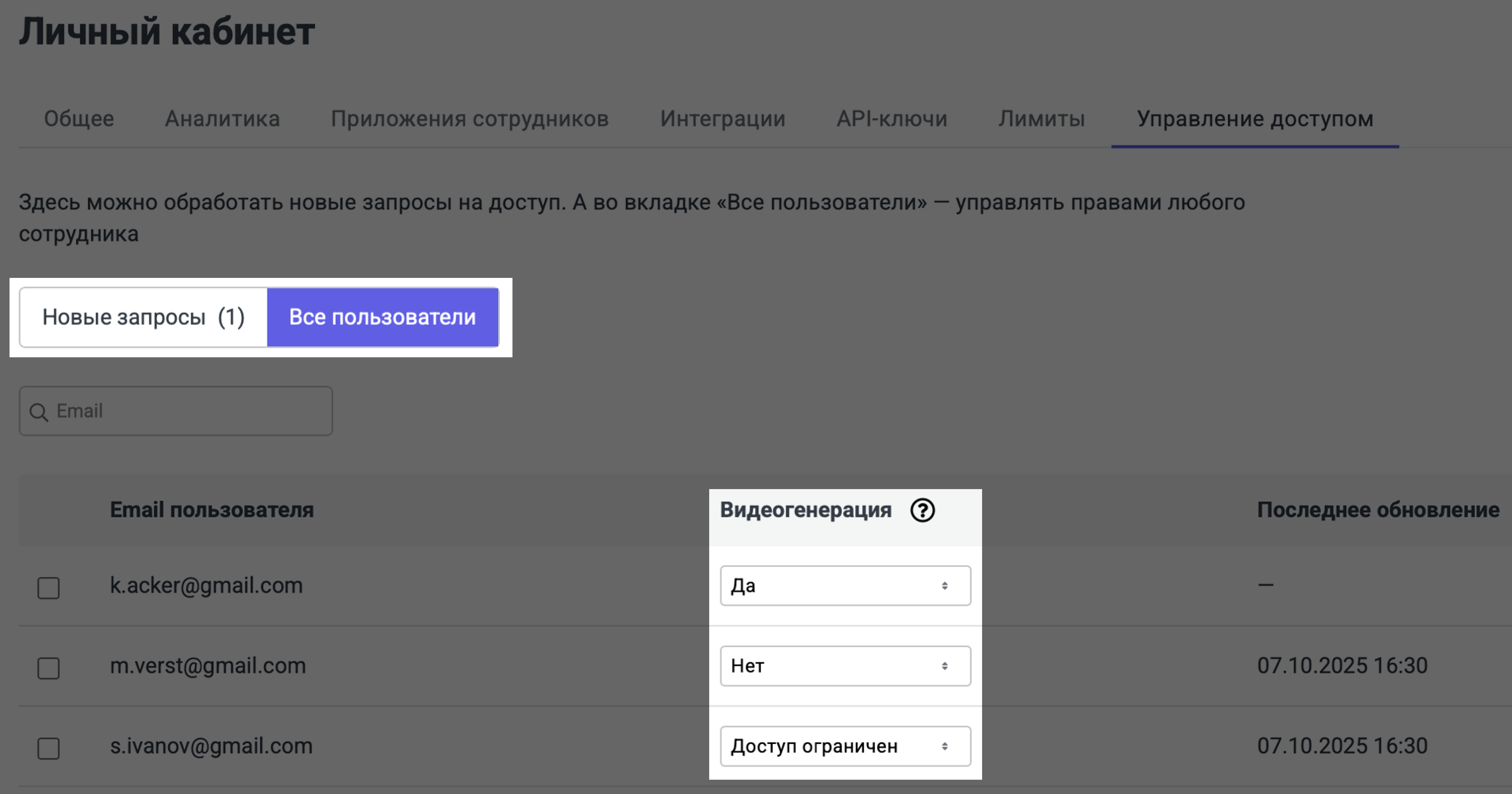 Чтобы изменить доступ для одного пользователя, нажмите на его статус в столбце Видеогенерация. Для группы — выберите нужных пользователей и используйте кнопки для массовых действий вверху таблицы.