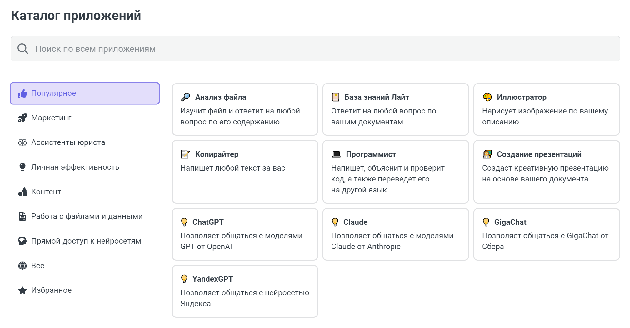 Прямой доступ к нейросетям. Если вам не хватает возможностей готовых приложений, таких как «Копирайтер», «Маркетинговое письмо», «Программист» и другие, вы можете работать с нейросетями напрямую. В этом случае вам нужно будет самостоятельно подбирать запрос (промт) к нейросети и настраивать ее параметры.