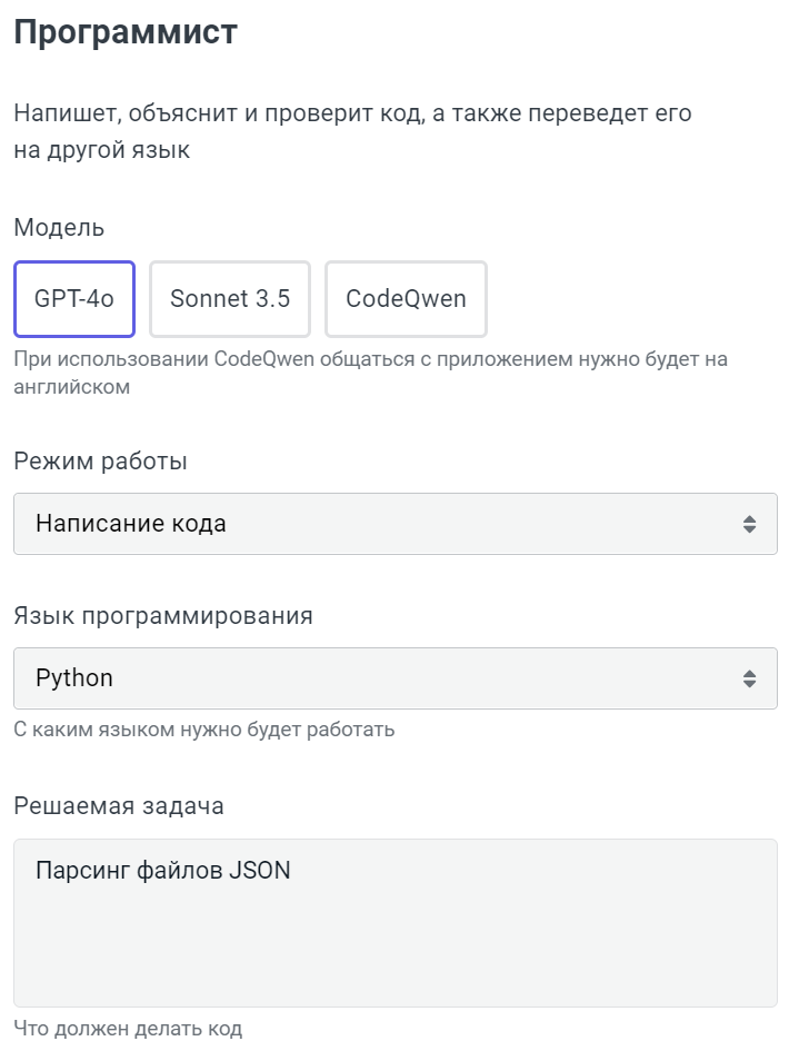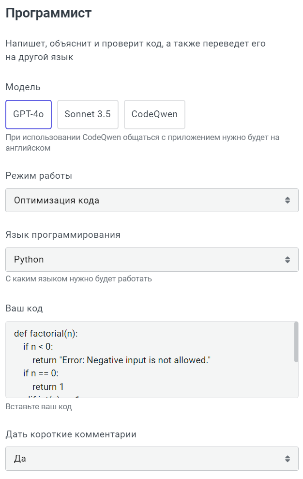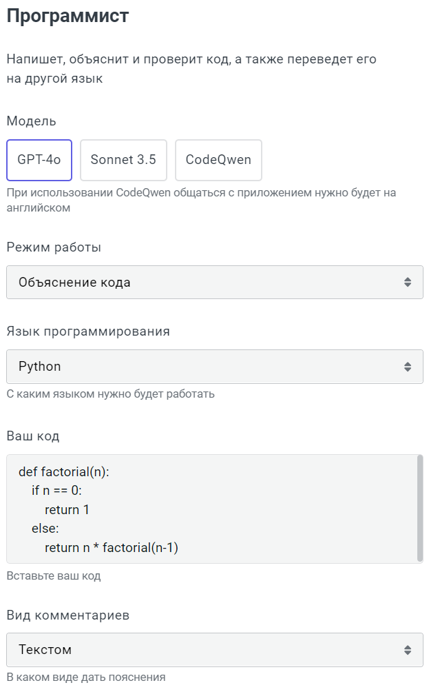 Приложение Программист может написать, объяснить и проверить код, а также перевести его на другой язык. Оно будет полезно разработчикам, тестировщикам, аналитикам и исследователям данных, а также специалистам, которые не владеют навыками программирования, но периодически сталкиваются с кодом в своей работе, например: технической поддержке или техническим писателям.