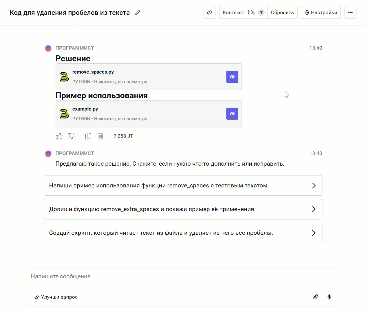 Сгенерированный код появится в чате в виде интерактивных блоков. Он позволяет открыть код в новой вкладке, скопировать его без лишних символов или скачать файлом:
