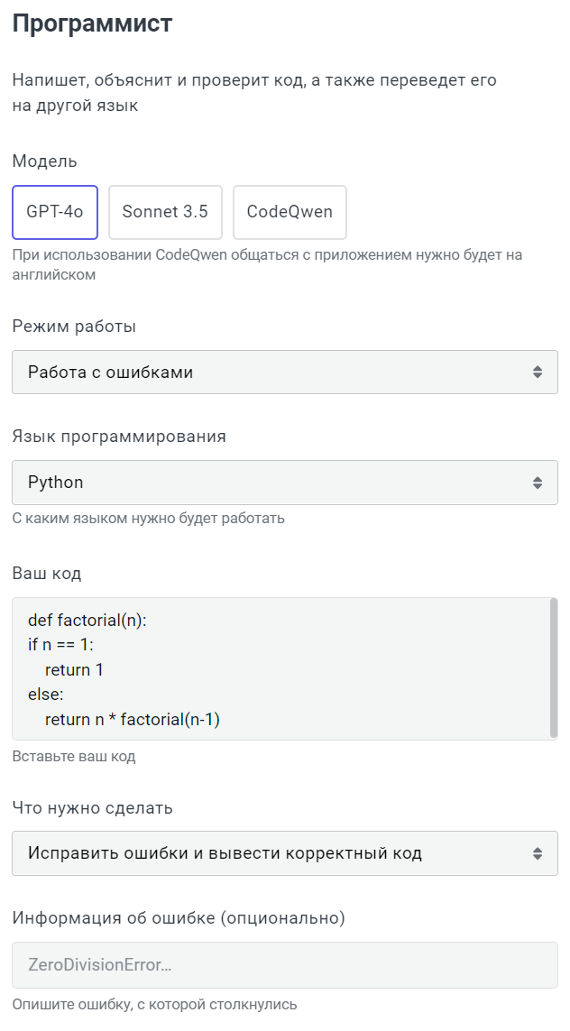 - Работа с ошибками: опишет ошибки в коде и как их исправить, даст исправленный вариант.
