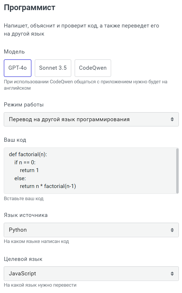 - Целевой язык: выберите язык программирования, на который нужно перевести ваш код.