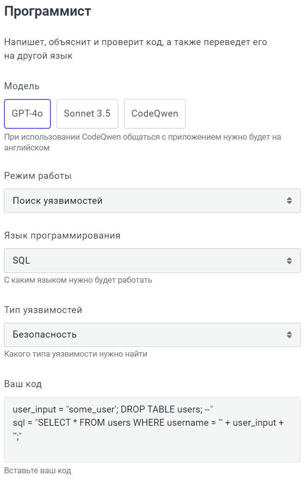- Поиск уязвимостей: оценит ваш код на наличие уязвимостей, связанных с памятью и безопасностью, и даст исправленный вариант.