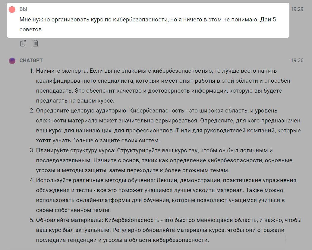 Ответ как будто бы банальный — а то мы сами не знали, что нам нужно структуру курса делать, — но когда перед нами белый лист, нейросеть может дать опору, с чего начать. Так, из 5 пунктов мы можем выбрать пункты про целевую аудиторию и последовательную структуру.