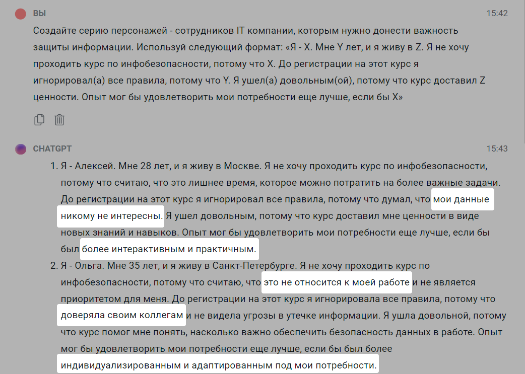 Видеозапись запросов и общения с ChatGPT в прямом режиме приводится как пример. В своих экспериментах вы можете задавать другие вопросы и построить беседу в другом ключе.