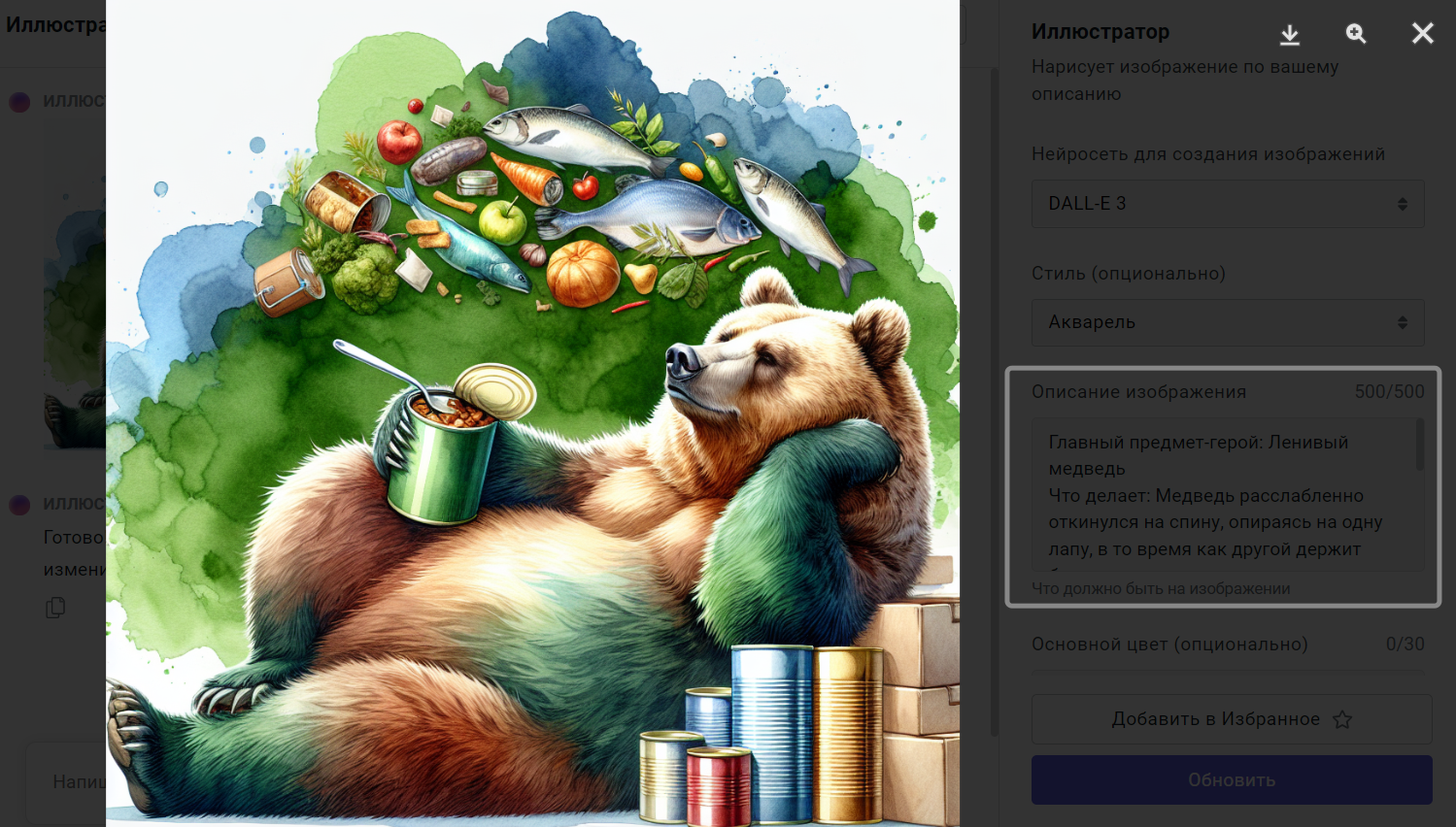 Артур копирует получившийся промт и вставляет его в приложение Иллюстратор. Выбирает стиль акварель и нейросеть DALL-E 3 и вот какой результат у него получается: