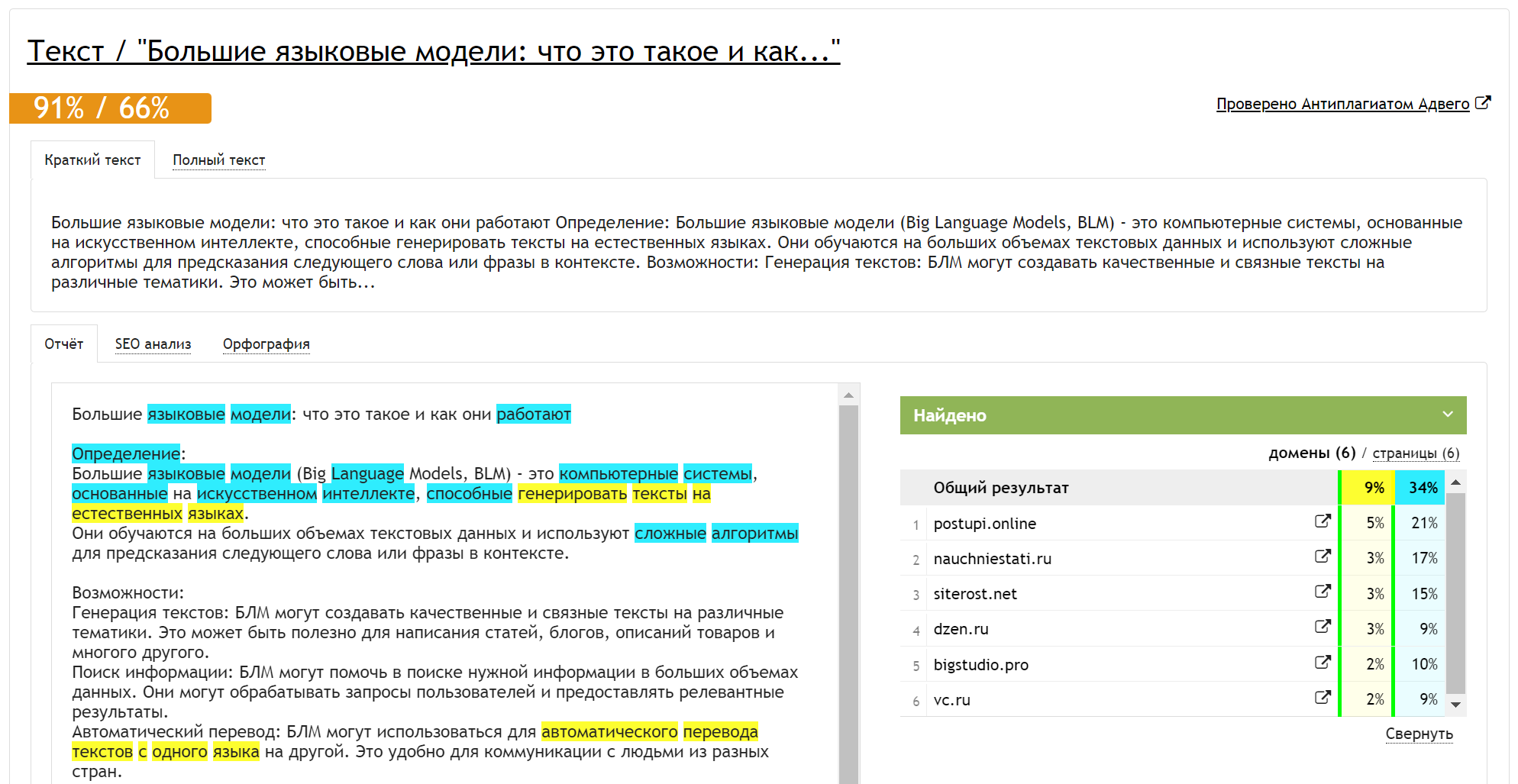 Результаты проверки этого варианта текста на сервисе TurboCheck: