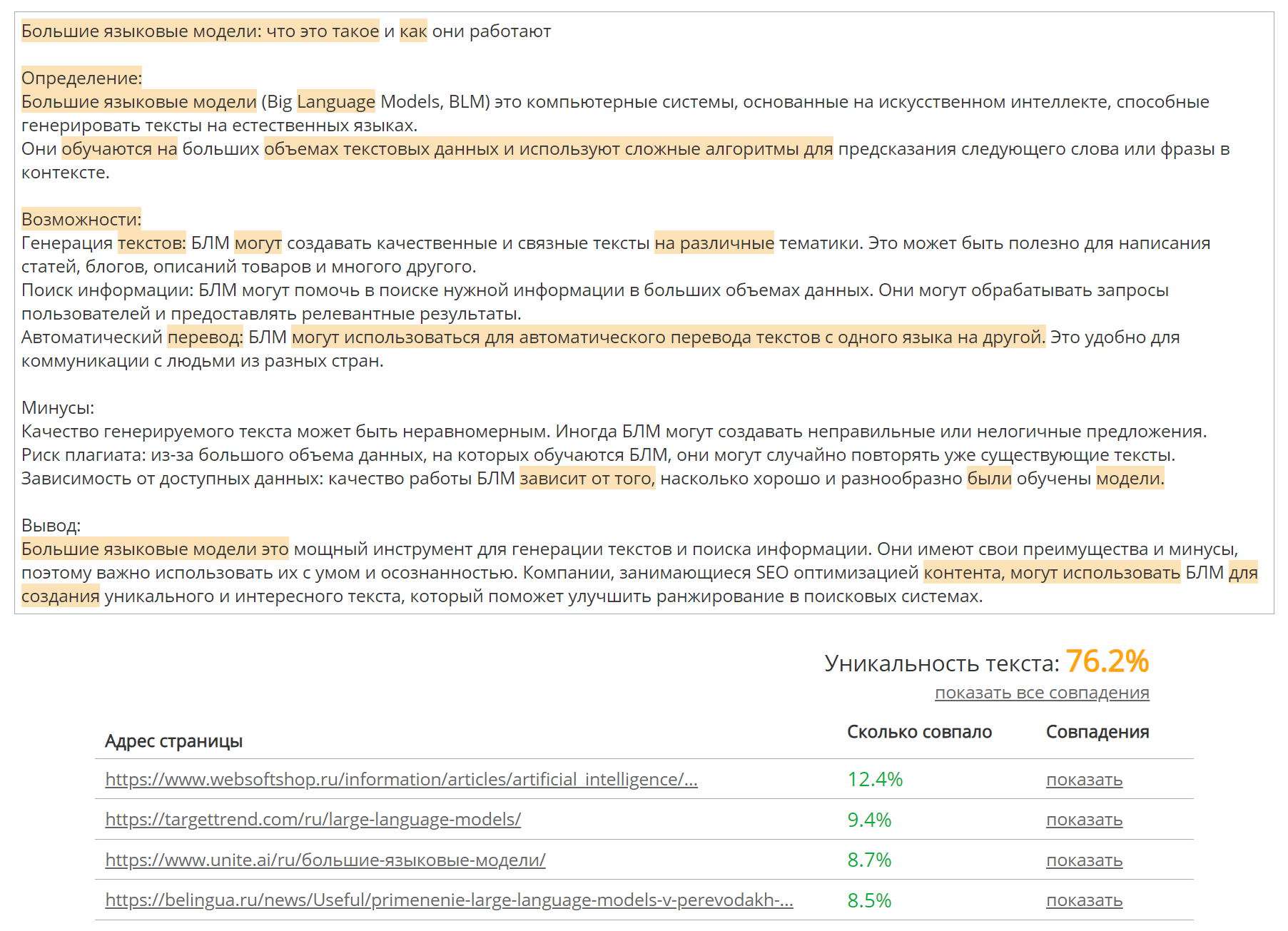 Сервис CONTENT WATCH оценил уникальность этого текста ниже, чем предыдущие сервисы, — на 76,2%: