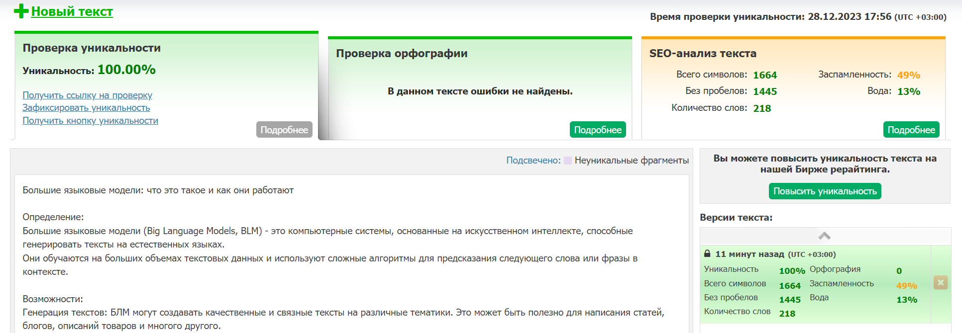Сервис Text.ru оценил текст от приложения «Копирайтер» так: уникальность — 100%, заспамленность — 49%, показатель воды — 13%: