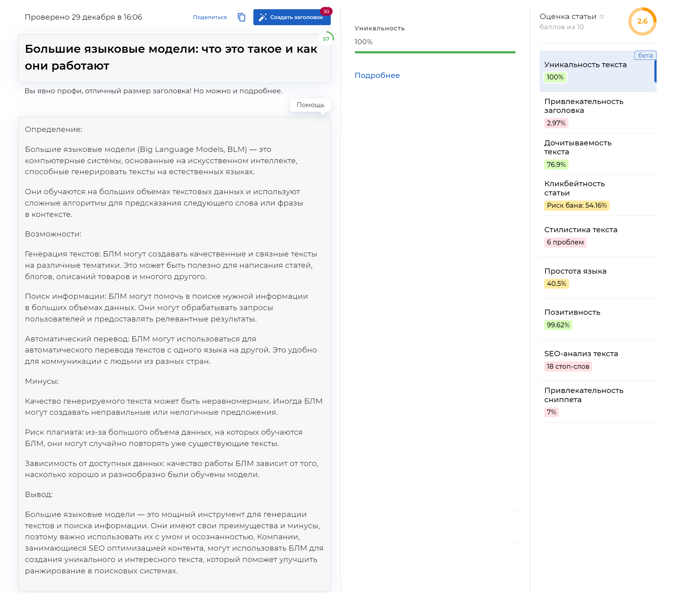 На сервисе TurboCheck мы оценили текст по параметрам: