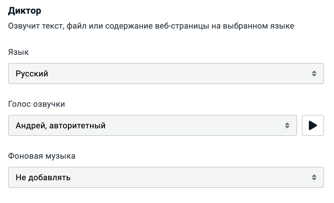 Приложение Диктор преобразует текст в речь. Вы выбираете язык и голос озвучивания, добавляете фоновую музыку (если необходимо), а приложение генерирует аудиофайл.