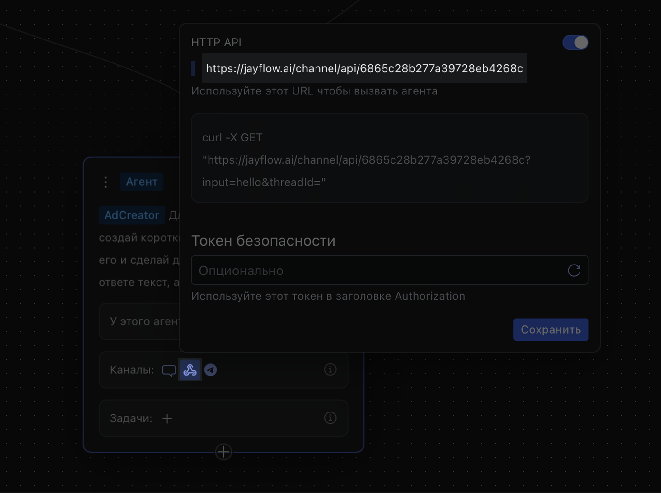 Скопируйте URL агента. Его можно найти в карточке агента Jay Flow: Каналы → HTTP API.