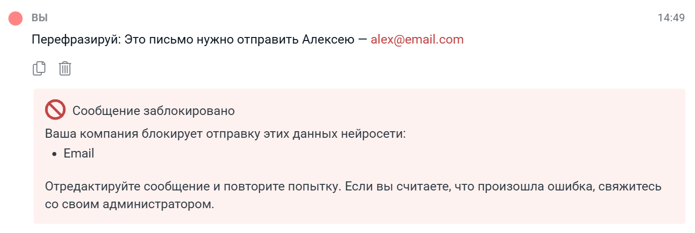 Если пользователь отправляет такой запрос в Jay Copilot, Jay Guard заблокирует его. При этом пользователь получит уведомление: